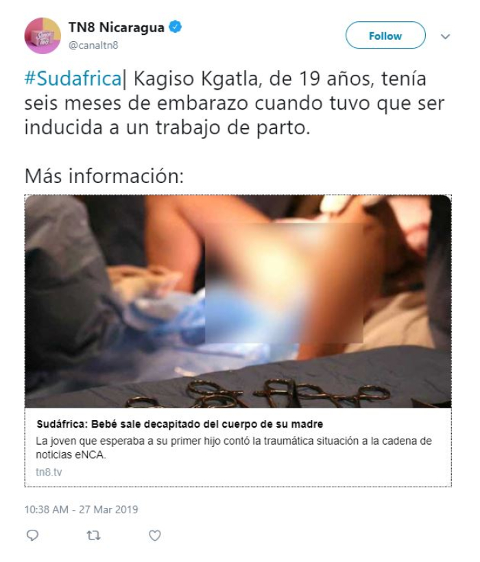 Кагисо Кгатла (19), која била во шестиот месец од бременоста и го очекувала првото дете, во страв гледала како од неа излегува само главата на бебето.