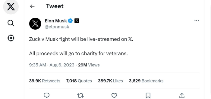 Сопственикот на Х (претходно „Твитер“), Илон Маск со објава на неговата социјална мрежа ја потврди борбата против сопственикот на „Фејсбук“, Марк Цукерберг.