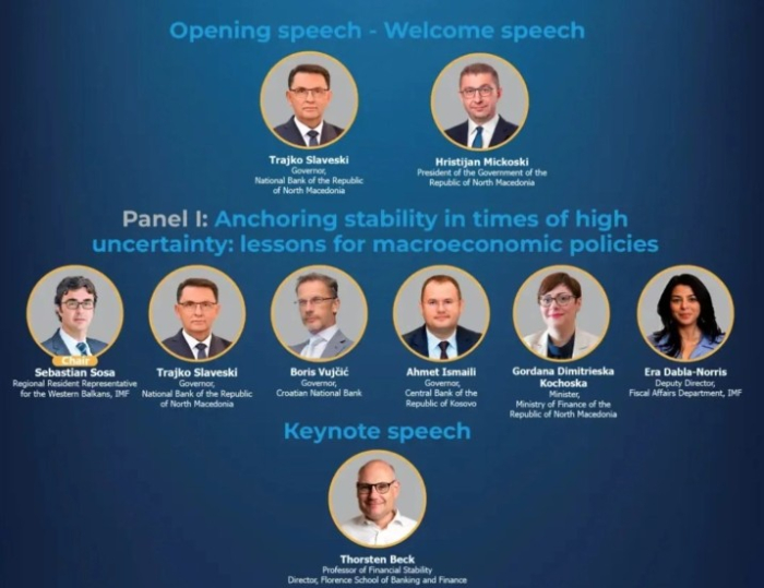 Првиот панел е посветен на темата „Зајакнување на стабилноста во услови на висока неизвесност: лекции за макроекономските политики“, а на него ќе се обратат гувернерот на НБ Трајко Славески, министерката за финансии Гордана Димитриеска Кочоска, гувернерот на Хрватската национална банка Борис Вујчиќ, гувернерот на Централната банка на Косово Ахмет Исмаили, заменик директорот на Одделот за фискални прашања при ММФ Ера Дабла Норис, како и професорот за финансиска стабилност и директор на Школата за банкарство и финансии во Фиренца Торстен Бек.